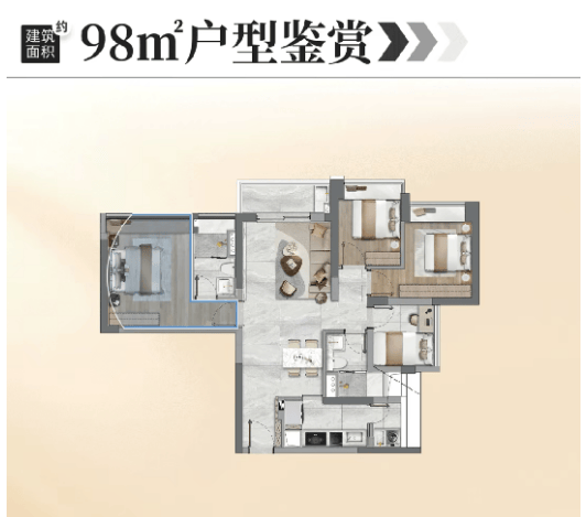 2. 建面约98㎡四房户型:该户型在区域内首次将四房的门槛做到100㎡以内,性价比极高,在同面积段项目中,大多只能做到上车小三房,而该户型能够一步到位,满足家庭各个阶段的居住需求,无需后期置换,节省置换成本与精力。