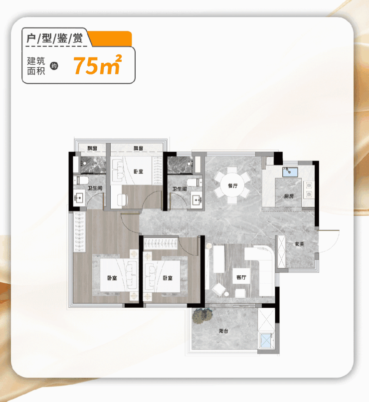 建面约75㎡三房户型,凭借超高实用率直接创死同面积竞品。