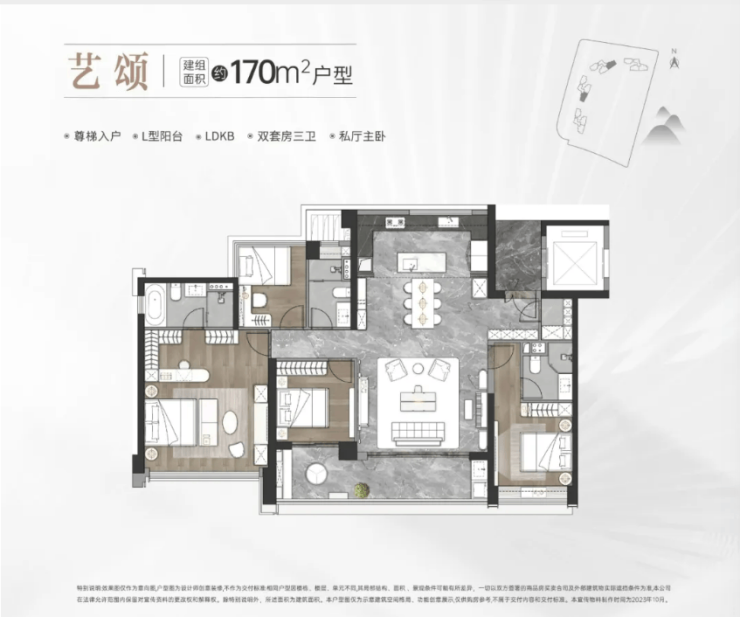 建面 170㎡大平层四房,主城稀缺改善大户型,南向全景采光面,超大尺度客厅、观景阳台,全屋套房规制,私密性、奢华感拉满,全景俯瞰白云山全景,适配高端大家庭、高端圈层自住,户型格局开阔大气,居住尺度顶级,得房率约 80%,高端改善空间利用率充足。