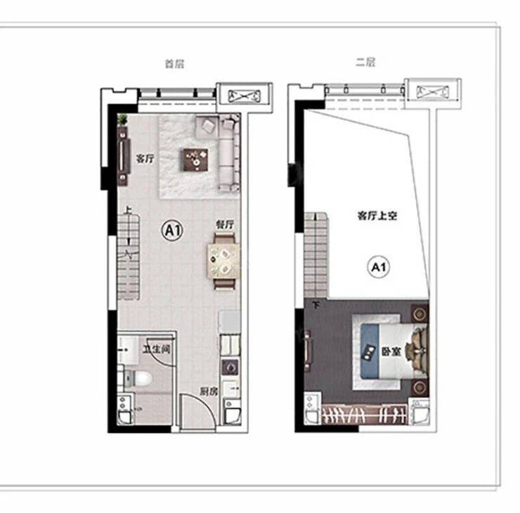 如果你追求更高的空间利用率,喜欢独特的居住体验,那么49.7㎡的阁楼户型绝对会让你眼前一亮。这款户型的层高达到了惊人的4.5米,为复式结构提供了绝佳的条件。