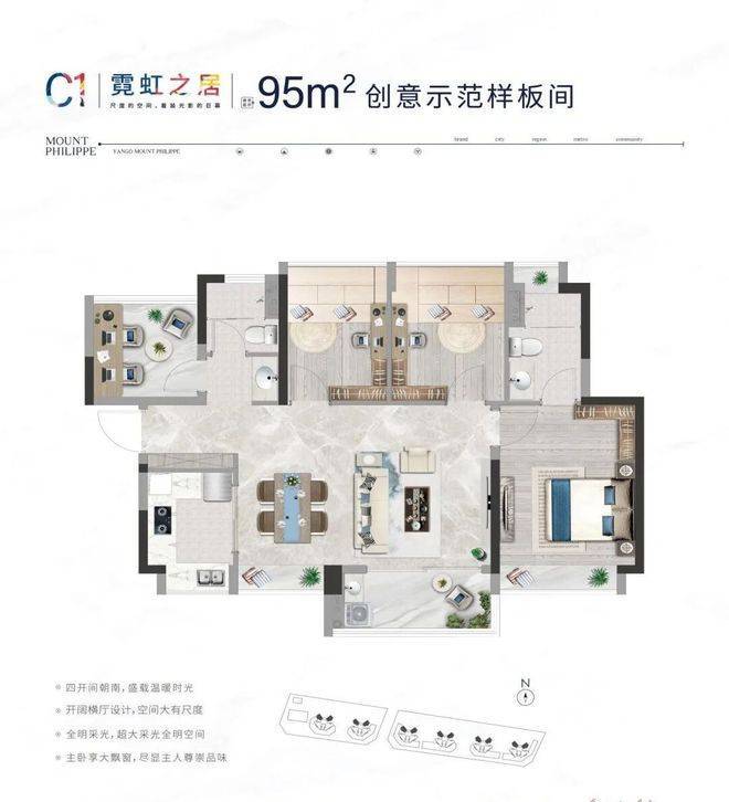 住宅户型设计科学合理,二房、三房及四房布局充分考虑空间通透性与生活动线,南北向采光充足,客厅与卧室相互独立,保障居住舒适性。主卧配备套间及飘窗设计,增加居住舒适感及采光效果。