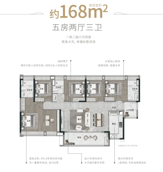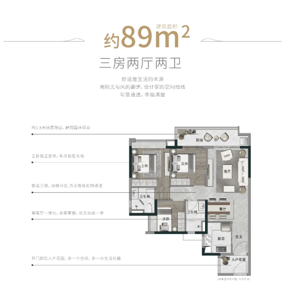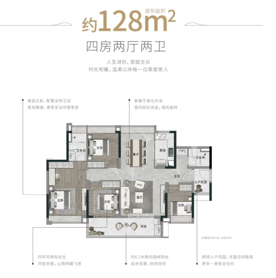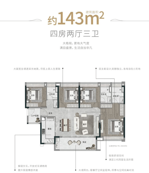 项目提供多元户型选择,精准覆盖刚需与改善客群。高层洋房主力户型为建面约89㎡三房、约115㎡四房、约143㎡四房及约168㎡五房,强调阔景视野与空间实用性;叠拼洋房则为建面约159-163㎡花园叠院,配置庭院、巨幕餐客厅及多层功能空间,满足家庭社交、休闲与私密生活的多重需求。总价约180万可购三房,280万可入手南北对流四房,性价比突出。