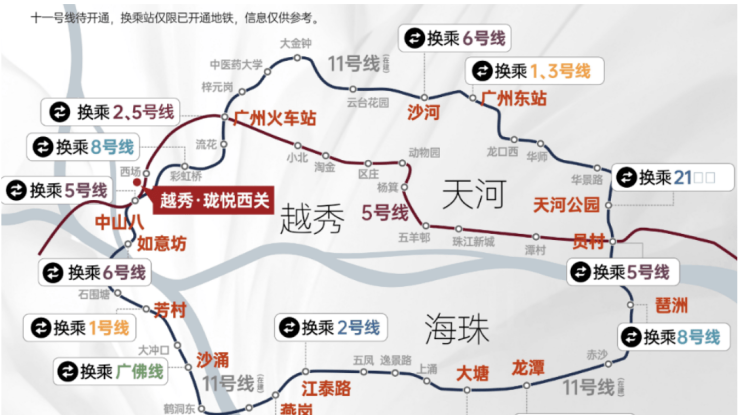 项目距离西场地铁站约900米,步行可达5号线和13号线二期,距离中山八站约1公里,可换乘11号线,形成多线交通网络。11号线为广州首条环线,可直达白鹅潭、海珠西、中大、琶洲、天河公园、天河北及广州东站,通勤效率极高。无论市区上班或跨区出行,项目均可实现便捷通达。交通布局合理,结合地铁、主干道和公交网络,提升日常通勤便利性,保证家庭生活节奏顺畅,同时赋予物业投资长期潜力。