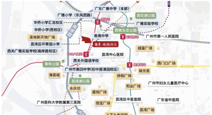 越秀珑悦西关所在老西关板块生活氛围浓厚,社区周边有成熟居民配套、街市、食堂和酒楼,生活便利且价格实惠。商业方面,距悦汇城、领展广场等大型商场仅10分钟车程,满足购物娱乐需求。生态方面,项目邻近河涌及流花湖公园、荔湾湖公园,提供丰富的休闲活动空间,适合家庭休闲、儿童游玩及长者散步。小区内部规划合理,步行便利,生活便利性和生态环境兼备,为业主营造高品质生活体验,同时兼顾便利性和休闲娱乐功能。