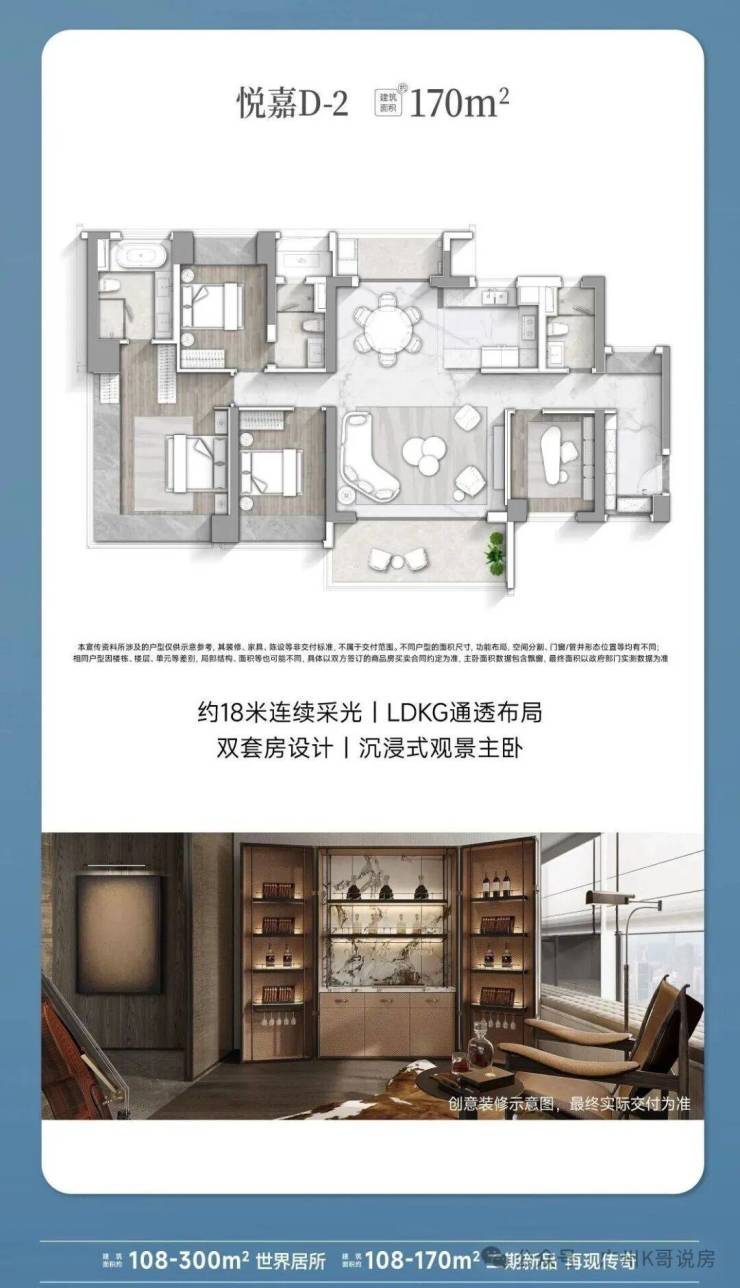 约 300㎡顶层复式:终极改善产品,总价约1950 万元起,三梯两户、双套房设计,约9.6 米南向景观阳台,超大露台,双层空间,满足高净值家庭终极改善需求。