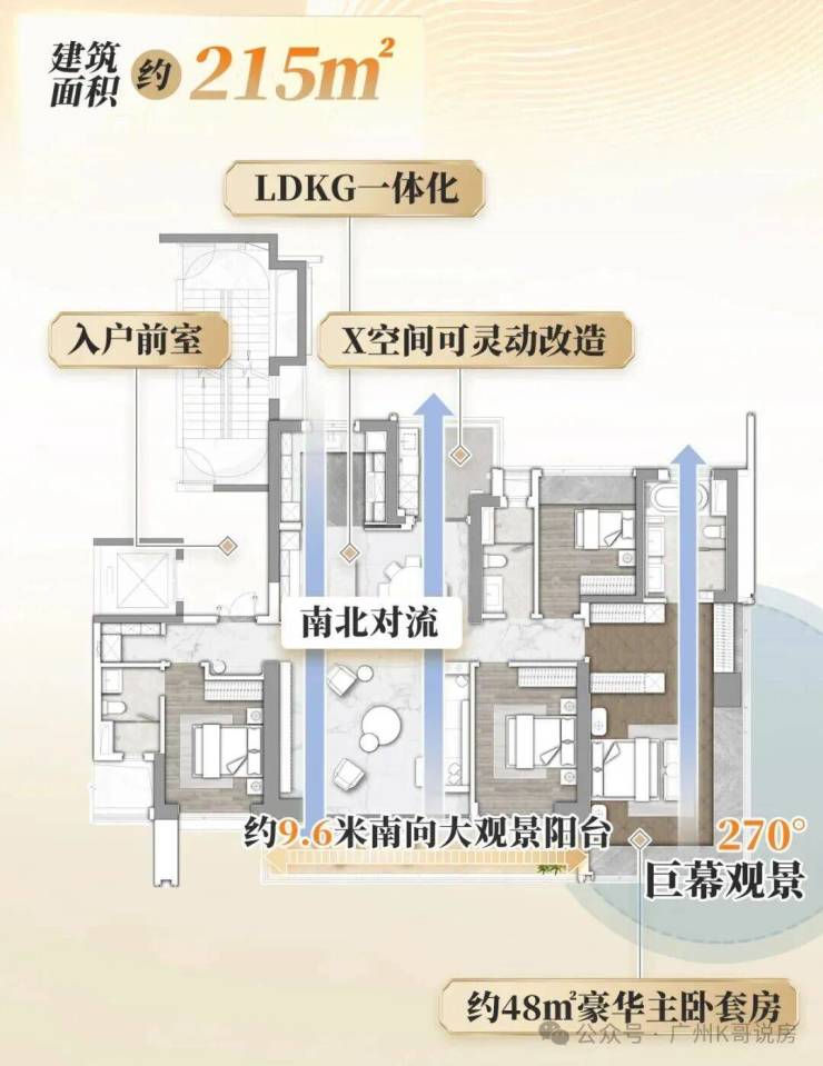 约 215㎡大平层:高端改善户型,总价约1300 万元起,两梯两户设计,约6 米阔绰客厅,三卧室朝南,270° 观景飘窗,纵览长隆文旅与社区园林双重景观,墅级居住体验;