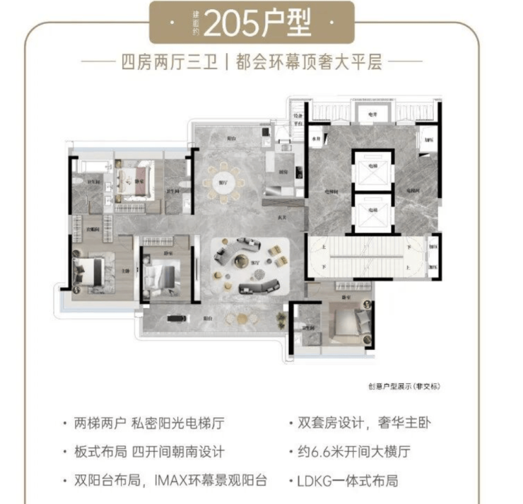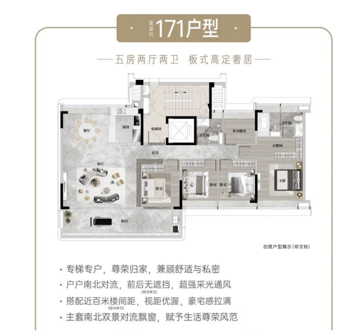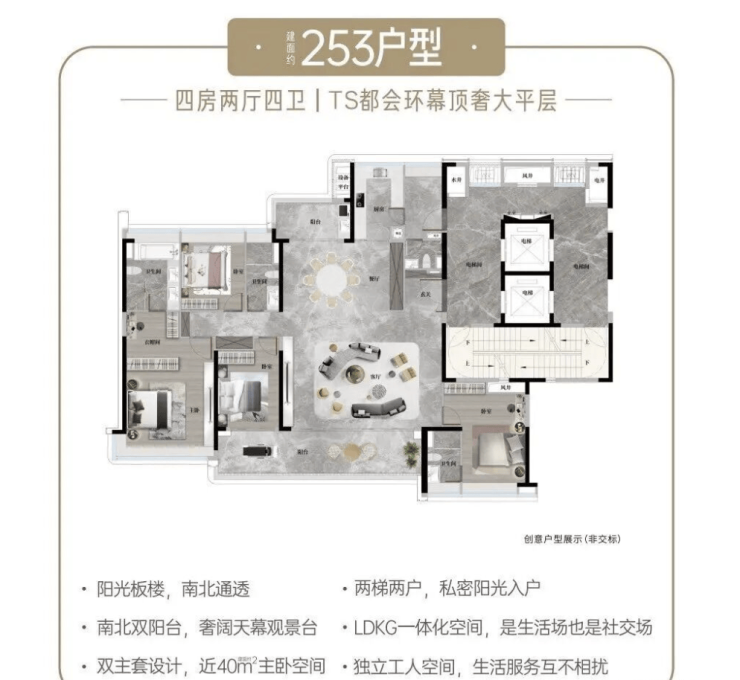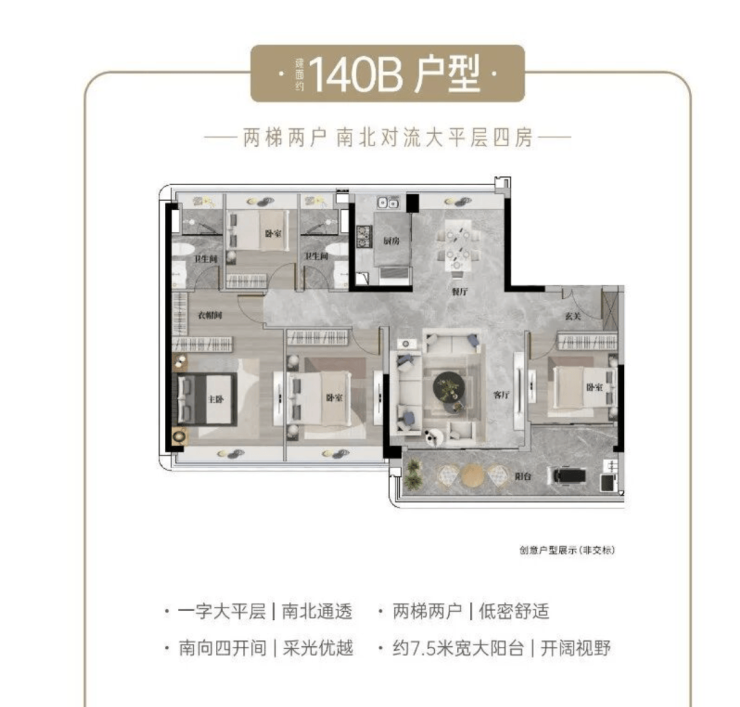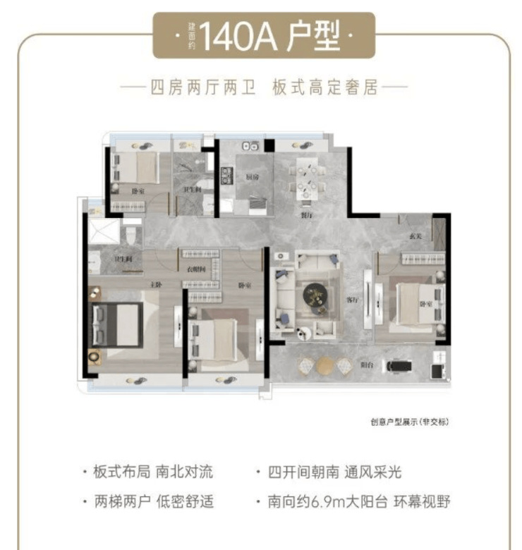 建面约140-253㎡四至五房板式户型,南北通透,全屋精装,低密设计兼顾奢适与实用性。