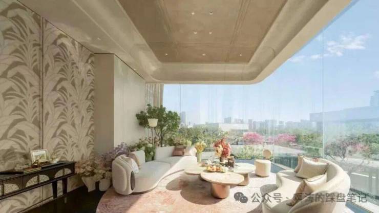 客厅连接着南向的超大观景阳台,阳台面宽超过 7 米,拥有无遮挡的白云山全景视野,站在阳台上,就能将白云山的连绵山色、白云新城的城市繁华,尽收眼底,视野极为震撼。这个超大阳台,可以根据主人的需求,灵活打造,一半作为观景休闲区,摆上茶桌、藤椅,打造一个空中观景茶室,闲暇的时候,和家人朋友一起,喝喝茶,看看山景,聊聊天,享受悠闲的时光;另一半可以打造成空中花园,种上自己喜欢的花草绿植,在城市的核心区,拥有一片属于自己的自然天地;也可以在这里摆放健身器材,打造一个空中健身房,一边健身,一边欣赏窗外的山景,享受健康的生活方式。