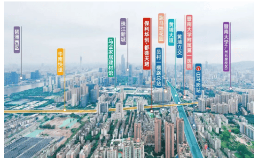 保利华创・都荟天珺位于珠城东、马场旁,华南快速与黄埔大道交汇处,与珠城东区仅隔一条马路,东侧邻近金融城核心区,南侧隔珠江对望琶洲西区,地理位置得天独厚。交通方面,自驾 10 分钟交通圈可抵达珠江新城、金融城、琶洲等核心区;公共交通方面,周边有地铁 5 号线、13 号线、21 号线,楼下在建 13 号线二期白马岗站(预计 2025 年底通车),未来出行更便捷,轻松联动全城核心资源。