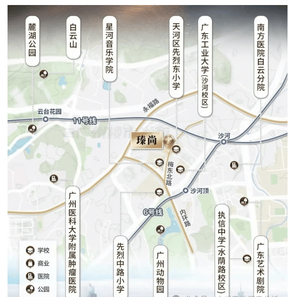 项目位于天河先烈东横路 38 号(沙河板块,天河与越秀交界),直线距离珠江新城约 2.6 公里,属于市中心核心圈,地段优势显著。交通配套十分便利,步行 500 米内可达地铁 6 号线沙河顶站 B 出口,1 站至沙河站换乘广州大环线 11 号线(串联多个核心区域),2 站至区庄站换乘东西大动脉 5 号线,3 站到淘金、6 站到北京路与珠江新城,1 小时内可覆盖广州主要商圈;自驾方面,快速接驳内环路、广园快速路及城市主干道,30 分钟内可达琶洲、白云新城等区域,无论是地铁通勤还是自驾出行,都能满足高端家庭日常出行需求,尤其适合在天河、越秀工作的人群。