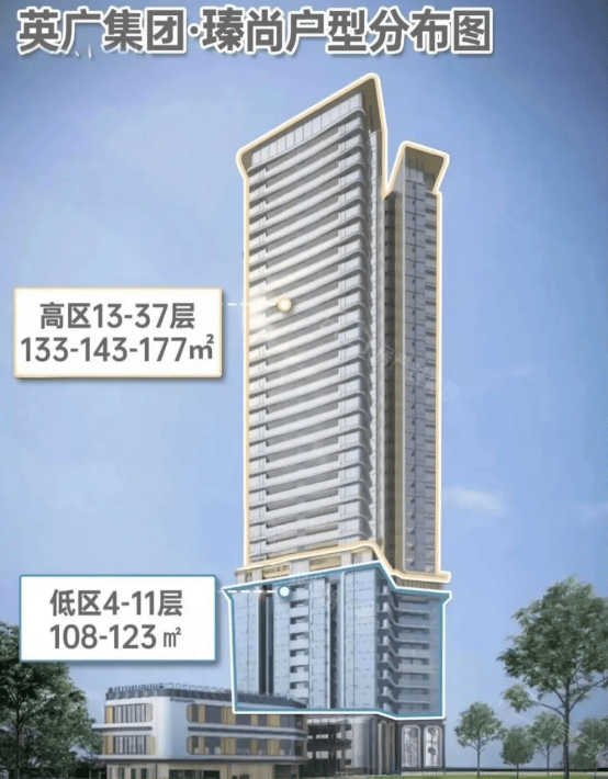 英广臻尚占地面积约 5478㎡,总建筑面积约 53112.46㎡,容积率 6,绿化率 30%,规划 1 栋 37 层单体楼(含低层裙楼商业与公建),共 208 户,车位配比 1:1.5(305 个车位),物业公司为广州市尚弘物业,物业费 5.8 元 /㎡/ 月。项目分高低区设计:低区(4-11 层)2 梯 8 户,主打 107-123㎡三房;高区(13-37 层)专梯专户,涵盖 133-177㎡三四房,12/23 层为架空层。建筑装修标准对标珠江新城豪宅,8 米挑高大堂、日本设计师操刀的 3800㎡园林(含日式凉亭、流水瀑布、屋顶花园,种植 4-5 棵罗汉松),还配备室内恒温泳池、健身房、瑜伽室等高端会所设施,整体定位高端改善,虽为单体楼,但通过细节配置提升居住品质。项目 2025 年 5 月 19 日开盘,预计 2027 年 6 月 25 日精装修交付,拿地时间为 2009 年(2022 年转让至英广集团),楼面价 502 元 /㎡。