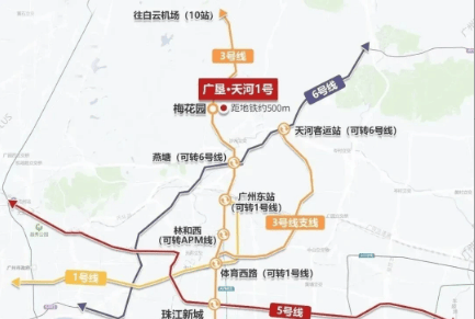答:直线距离地铁3号线梅花园站B出口约400米,步行出行便捷,地铁2站抵达广州东站,5站直达珠江新城,通勤效率优越。