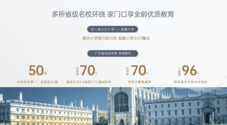 中小学:3公里内覆盖广州外国语学校附属小学(省一级)、广大附中南沙实验学校(市重点),12年全龄教育链。