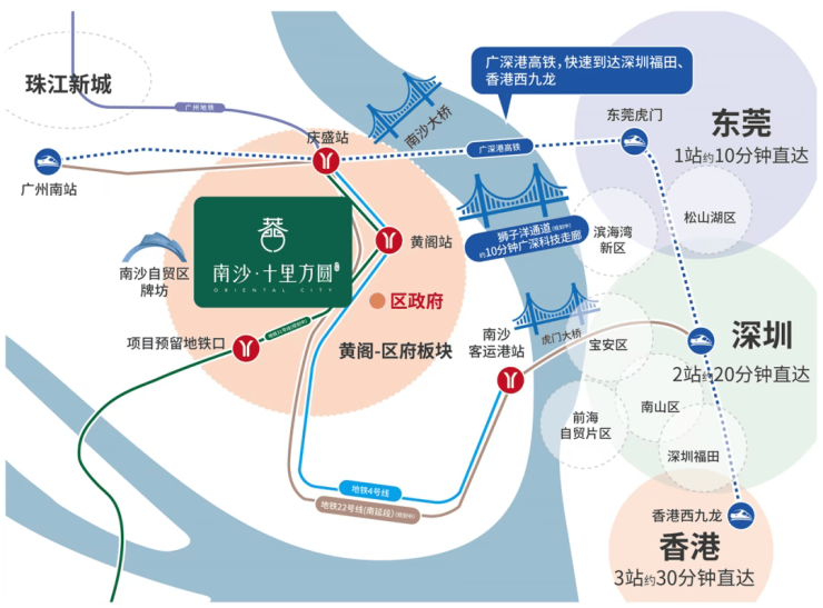 更值得期待的是,狮子洋通道(预计2027年建成)距项目仅5分钟车程。这条双层16车道的超级跨江通道,将实现南沙与东莞、深圳的高效连接,未来30分钟直达深圳前海,真正融入“广深半小时生活圈”。同时,庆盛高铁站21分钟到深圳、35分钟抵香港,九大高铁线路交汇,让世界触手可及。