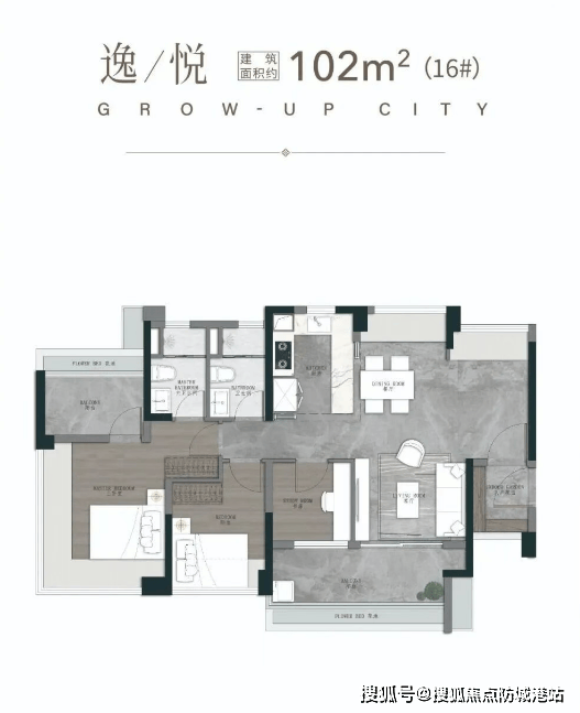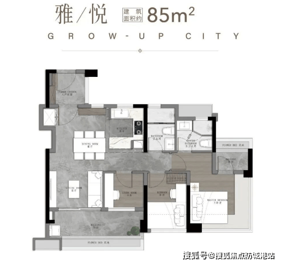 86㎡三房:南向4开间,约11.1m采光,双进私密玄关,5.4m跑道式阳台,主卧270°无立柱景观飘窗。