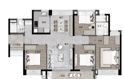 横厅布局,约6米面宽超大客厅;主卧面宽约4米。