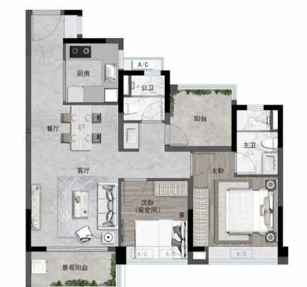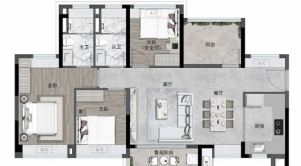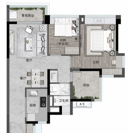 横厅设计,客厅面宽达6.2米,景观阳台约5.5米面宽。