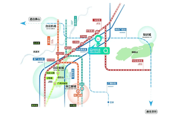 在建的 18 号线北延段未来将在白云东平站与 14 号线交汇,换乘 7 站就能抵达冼村,进一步拉近与市中心的距离。城轨方面,可到竹料站换乘广佛环线(全线工程累计完成 93%,预计 2024 年通车),3 站到天河智慧城、5 站到琶洲;新白广城轨(在建中)则能 1 站直达白云机场,南向还可通达东莞和深圳。自驾出行也十分便利,华南快速、京港澳高速、机场第二高速等主干道环绕,轻松纵横大湾区。