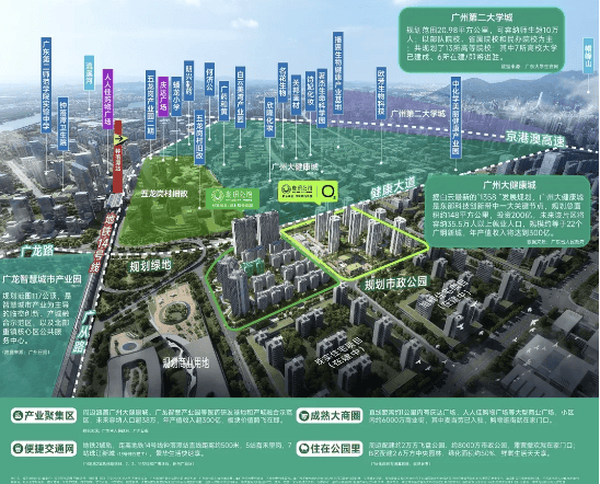 项目所在的钟落潭板块,不仅是千亿级美丽健康城核心,还是广州第二大学城所在地。美丽健康城投资 200 亿,规模约等于 22 个广钢新城,已吸引何济公、广药集团等 29 家知名健康产业企业入驻;广州第二大学城已有 13 所高等教育院校,包括仲恺农业工程学院、广东白云学院等本科大学,产业与人才资源为板块发展注入强劲动力。此外,项目高层可眺望帽峰山,周边生态环境良好,随着板块发展,未来居住品质与区域价值还将持续提升。