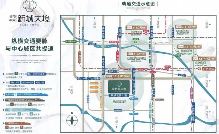 在轨道交通方面:步行约 600 米到达佛山一号线三期新隆站,直接连同禅城、桂城和广州, 未来 3 站可以到达佛山新城,4 站通城南。(目前规划中) 另外连接广州、佛山、江门和珠海四个大湾区核心城市的广佛江珠城轨,其中一个站点—— 乐从站,也设在项目周边,可以非常方面去到这四个城市。