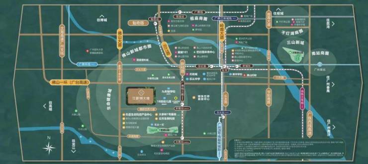 通过项目东面的新桂路,向北约 3 公里可直达乐从人气最旺商场天佑城,新 桂路往北直接连通汾江路,约 6 公里到达禅城城区。项目东面还有一条岭南大道,向北约 4 公里 可以去到佛山新城的世纪莲体育中心、往北约 15 分钟去到亚艺湖、约 30 分钟到达千灯湖。项目 西面直接连接佛山大道:直达十里家居长廊,往北 10 分钟到禅城,20 来分钟去到南海大沥。