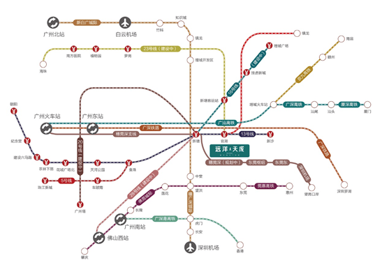 项目依托新塘 TOD 核心枢纽,构建覆盖轨道交通、城市路网、高速路网的多维立体交通体系,实现广州主城与粤港澳大湾区城市群的快速联动。新塘 TOD 规划汇集 10 条轨道交通线路,包含 3 条国家铁路、2 条城际轨道、5 条城市地铁,是湾区核心交通枢纽。项目距离地铁 13 号线官湖站约 1.1 公里,步行可达站点,乘坐地铁 1 站即可抵达新塘 TOD 枢纽,4 站直达黄埔片区,13 号线二期建成后可无需换乘直达珠江新城。区域交通路网持续升级,茅山大道已全线通车,构建区域南北交通大动脉,大幅缩短片区通勤距离。项目周边高速路网密集,可快速接入珠三角环线高速、广深高速等骨干线路,驾车约 10 分钟可达高速出入口,1 小时内通达珠三角主要城市,全方位满足日常通勤、跨城出行、商务往来等多元出行需求。