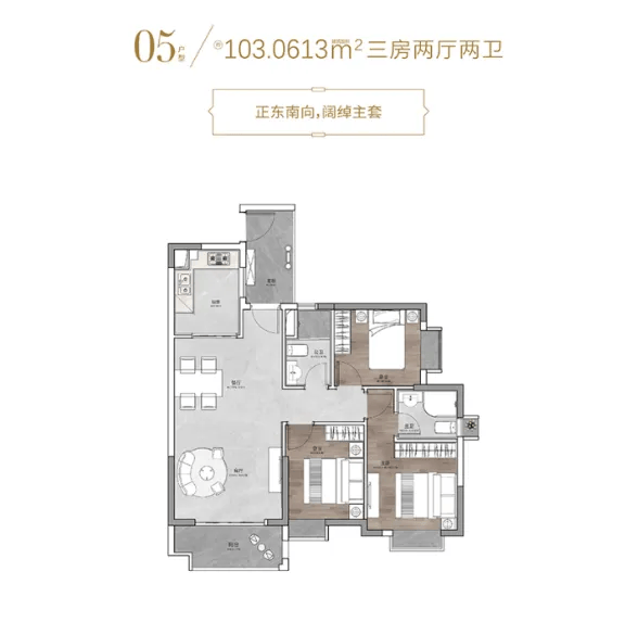 103㎡三房两厅两卫:南北对流,开放式客餐厅适合家庭聚会,卧室布局独立互不干扰,部分高楼层单位视野开阔,可远眺城市景观,满足品质生活追求。