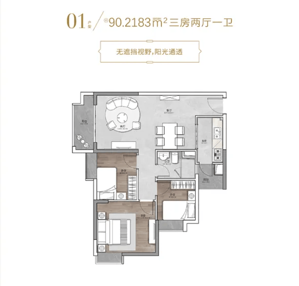 90㎡三房两厅一卫:户型方正,独立玄关提升私密性,客餐厅一体化增强互动感,动静分区明确,南向房间多,冬暖夏凉,适合三口之家。