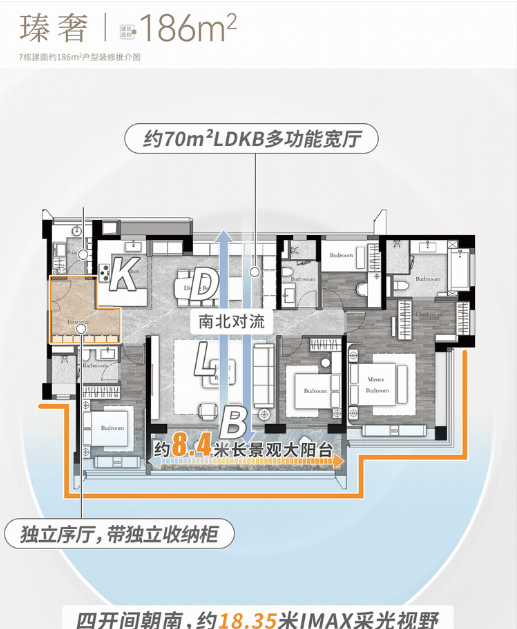 建面约186㎡户型:4房+2厅+3卫+灵动空间,正南向01、02户型可直览一线花地湾河涌景观,全明四开间朝南,拥有约18.3米极致奢幕视野,空间恢弘大气,尽显高端改善气质。采用LDKB洄游路线设计,搭配超80㎡多功能巨幕宽厅,多功能岛台灵活使用,精致展示柜完美收纳,满足业主高端社交与日常居住的双重需求;超40㎡端厅套房主卧,按照酒店总统套房标准打造,舒适度拉满,为业主提供私密、奢华的居住体验。