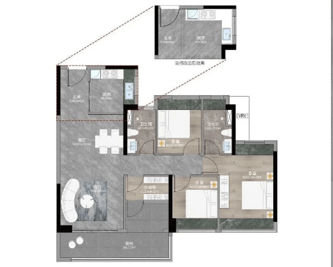 东建明德城本次悦府1座加推主力户型为90-109-117㎡三四房,采用佛山新规设计理念,使用率最高接近100%,是主城核心区稀缺的高拓实用户型。90㎡三房户型采用四开间朝南+横厅设计,南向超大面宽最大化引入阳光与景观,独立玄关保障归家私密度,阔景阳台连通餐客厅,空间开阔通透;全屋动静分区合理,两间次卧集中布局,主卧为套房设计,独立卫浴搭配观景飘窗,完美适配刚需三口之家。109㎡四房户型采用竖厅布局,客厅、灵动空间、长辈房、主卧四开间朝南,采光面与景观面全面拉满;阳台连通客厅与灵动空间,拓展室内使用空间,主卧南北双落地飘窗设计,采光通风效果优异,四房格局完美适配二孩家庭或三代同堂。117㎡四房户型为109㎡户型的升级放大版,空间尺度更奢阔,主卫采用横向设计,使用舒适度与便利性进一步提升,全屋高使用率设计搭配全明通透格局,兼具改善质感与实用属性。所有户型均配备入户玄关、多飘窗赠送、高效收纳体系,空间利用率与居住舒适度双重拉满。