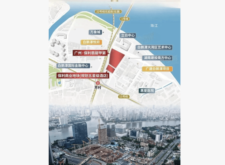 广州保利翡丽甲第,由广东保利置业有限公司旗下广州保雅置业负责开发建设,是保利置业TOP级甲第系作品,承载着“以东方风骨,铸世界器度”的核心设计理念,践行“大匠无界,通融传世”的精神,打造兼具地域文化底蕴与当代高端品质的稀贵居所。项目坐落于广州白鹅潭陆居路地块,地处白鹅潭CBD核心区域,占据江岸黄金1公里稀缺地段,是区域内近三年内唯一的一线望江新房,住宅用地占比不足8%,稀缺性不言而喻。