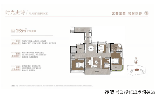 253平户型:四房两厅三卫设计,为项目楼王户型,仅分布在2栋楼,两梯两户设计,圈层更纯粹。户型采用竖厅设计,南北对流,通风采光一流;配备10米长景观阳台,视野开阔,可全方位欣赏周边景观;主卧飘窗与主卫均为270°弧形采光面,采光与视野极佳,居住舒适度与私密性拉满,适配高端终极改善人群。