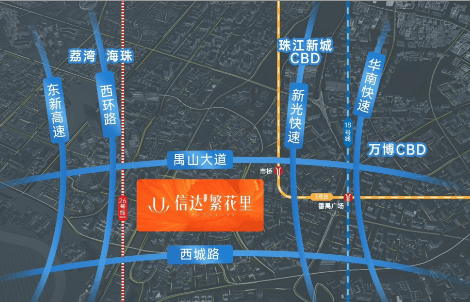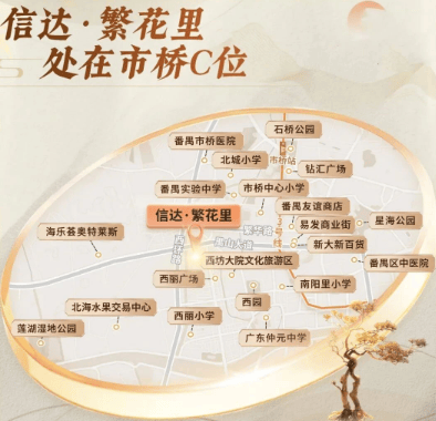信达·繁花里定位广州番禺市桥都会核心奢居,择址禺山大道南侧城芯贵地,占据广州城市发展中轴重要节点,是番禺行政、文化、商业三重核心交汇之地,周边汇聚番禺区政府、海关、税务局等政务机构,地段含金量毋庸置疑。从择址逻辑来看,项目兼具城市战略价值、自然资源禀赋与人文底蕴三大核心优势,市桥作为番禺传统核心板块,历经数十年发展,形成了浓厚的广府烟火气息与成熟的生活氛围,近十年无新增宅地供应,土地稀缺性堪比珠江新城、琶洲等主城核心板块,成为不可复制的城芯人居宝地。项目周边20-30年老旧小区占比高达74%,海量改善置换需求亟待释放,信达·繁花里作为板块唯一全新住宅项目,精准填补区域高端人居空白,兼具居住价值与资产增值潜力。同时,项目拥揽市桥水道生态景观与双公园自然资源,将城芯繁华与自然静谧完美融合,既享有老城醇熟配套,又拥享生态宜居环境,成为广州主城难得的城芯生态奢居范本。