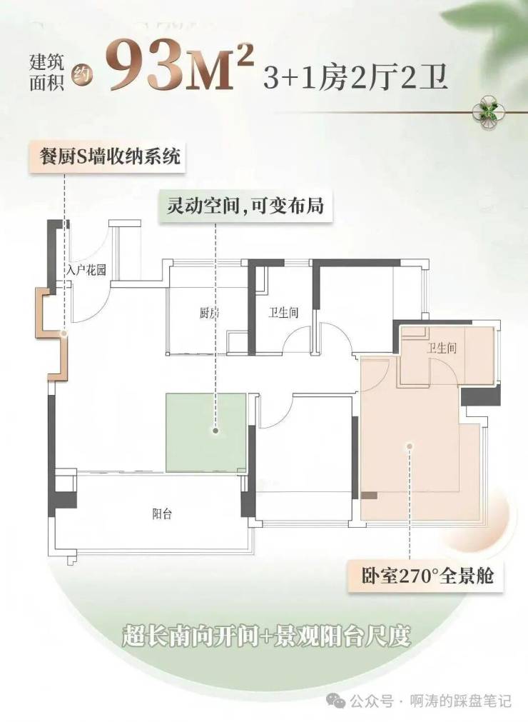 除了朝向优势,麓云台在空间布局上也极具巧思。以79平方米户型为例,其超大宽厅设计既可作为家庭聚会的大客厅,也能通过灵活的隔断改造成第三间独立卧室。这种可变空间的概念,极大地提升了小面积住宅的功能性与适应性,满足了不同家庭结构在不同生命周期内的需求。而在93平方米户型中,餐厨区采用了S墙收纳系统,冰箱嵌入墙体,不仅节省了宝贵的室内空间,更使整体视觉效果更加整洁美观,体现了现代家居设计的精细化趋势。
