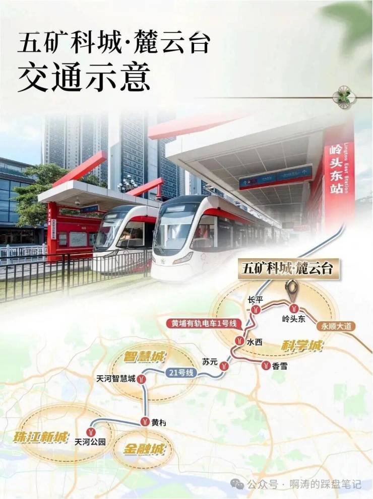 A3: 项目紧邻黄埔有轨电车1号线岭头东站,距地铁21号线长平站约3.3公里。自驾可通过永顺大道直达科学城,经广汕路可达天河智慧城,交通便利。