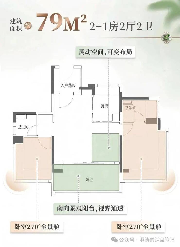 建筑新规的核心在于鼓励更高的得房率和更人性化的空间设计。麓云台充分利用了这一政策红利,推出了全南向的产品布局。在传统的北方或老旧城区住宅中,南北通透是常态,但在南方高密度城市,全南向设计却显得尤为珍贵。麓云台所有楼栋均做到了全南向朝向,这意味着无论是客厅还是卧室,都能享受到最充足的日照时间。特别是79平方米的户型,采用了三开间朝南的设计,双卧室均配备了L型飘窗,让阳光毫无遮挡地洒进每个房间。这种设计不仅提升了居住的舒适度,更在视觉上扩大了室内空间感。