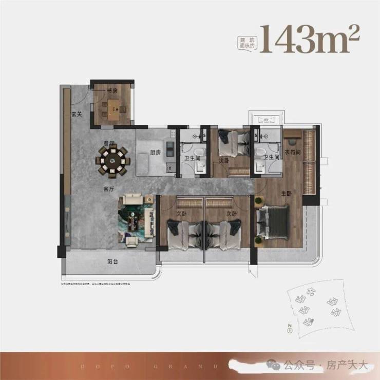 建面约 143㎡四房户型,是高端改善家庭的理想之选,实现南向宽景四开间设计,约 36.5 米环幕采光面让全屋通透明亮,阳光与清风时刻相伴。户型配备多元化功能阳台、独立衣帽间、阔绰主卧套房等设计,空间尺度奢阔,功能分区合理,为改善家庭打造高阶舒居体验,彰显居住品质与身份格调。
