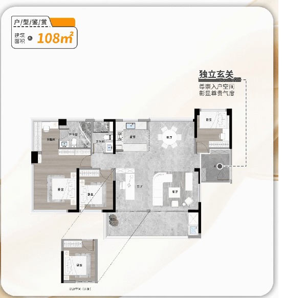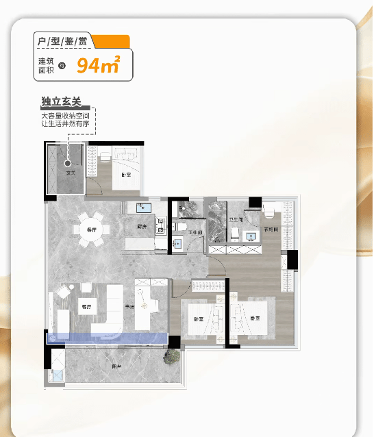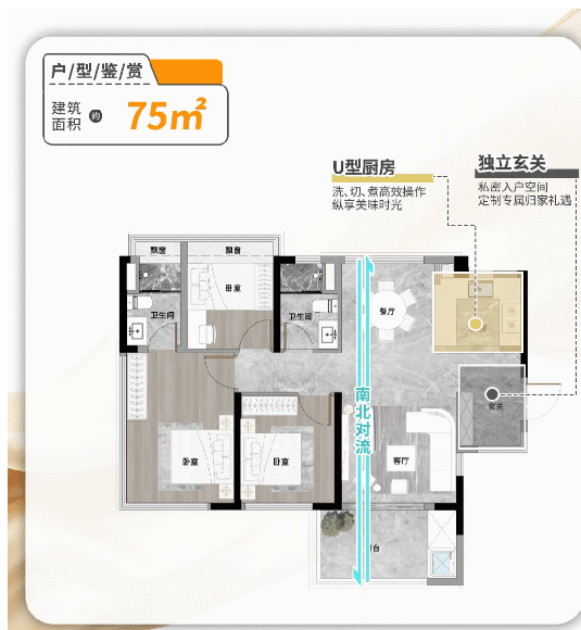 项目规划 4 栋住宅,计划首开 1 栋,总高 32 层,2T5 户。首开户型包括东南向建面约 75 平三房,西南 / 东南建面约 94 平三房(可做四房),以及南北对流建面约 108 平的四房,使用率超 120%。建面约 75㎡三房户型,独立玄关可改储藏室,U 型厨房操作空间大,主套拥有 270° 环幕视野;建面约 94㎡四房户型,LDKG 一体化设计增加互动性,约 6.4 米超大阳台功能多样;建面约 108㎡四房户型,约 15 米南向超大面宽,餐客厅连通约 7.2 米南向阔景阳台,主卧带步入式衣帽间。