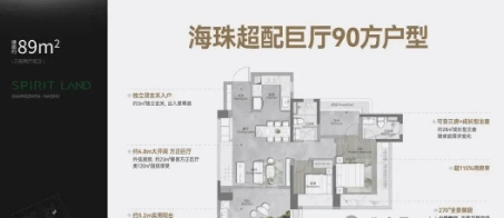 建面约89㎡三房两厅两卫:高使用率,LDKG+X一体化设计。