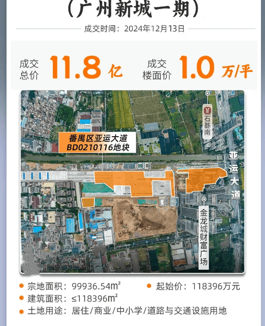 拿地时间:2024年12月,广州地铁成功拍下亚运大道BD0210116地块(广州新城一期),折合拿地价约1万/㎡,具备显著的价格优势和成本可控性,为项目打造高性价比房源奠定了坚实基础。
