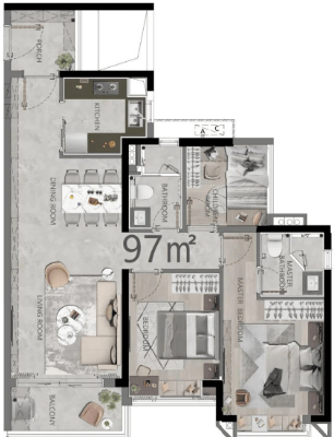 珠光海珠新城打造建面约97-140㎡全龄段户型产品,得房率稳定在83%-85%,户型设计兼顾采光、通透、实用三大核心优势,覆盖刚需三口之家至改善型四房家庭,满足不同阶段居住需求。其中建面约97㎡三房两厅两卫户型,配备专属入户花园,三开间朝南布局,采光面充足,室内明亮通透,搭配N+1灵动可变空间,可根据家庭需求灵活改造,主卧配备阔景飘窗,拓展景观视野与使用空间,整体格局方正,动静分区合理,是主城刚需置业优选户型。