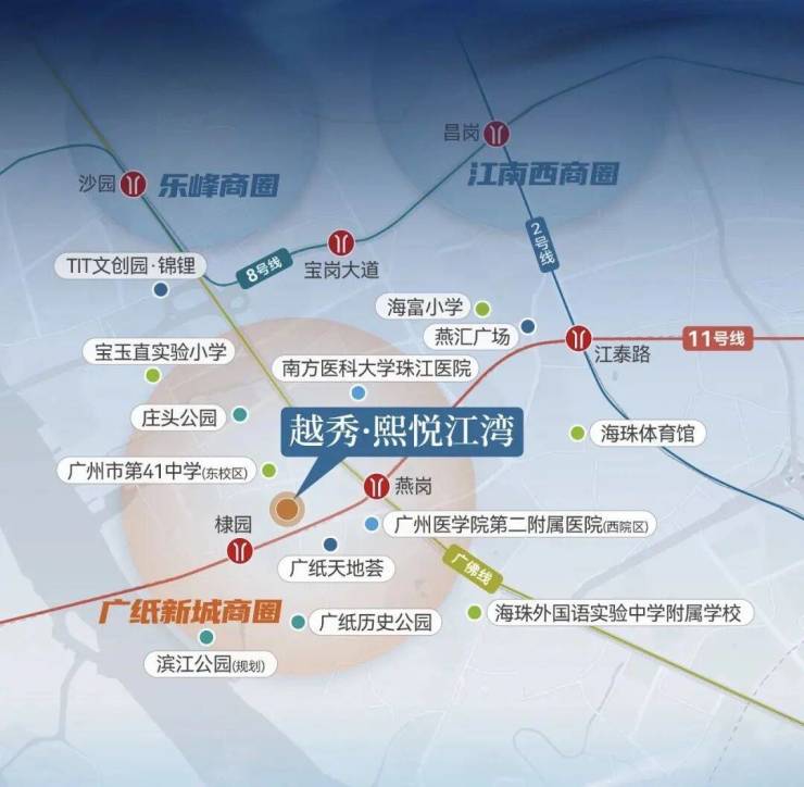 在配套方面,项目优势同样显著。双地铁上盖,距离广佛线燕岗站约400米、11号线棣园站约250米,11号线已开通,轻松链接天河、越秀、荔湾等区域,通勤出行十分便捷;教育配套完善,对口学校升级为宝玉直实验星悦小学,周边名校环伺;生活配套成熟,三大商圈环绕,多家三甲