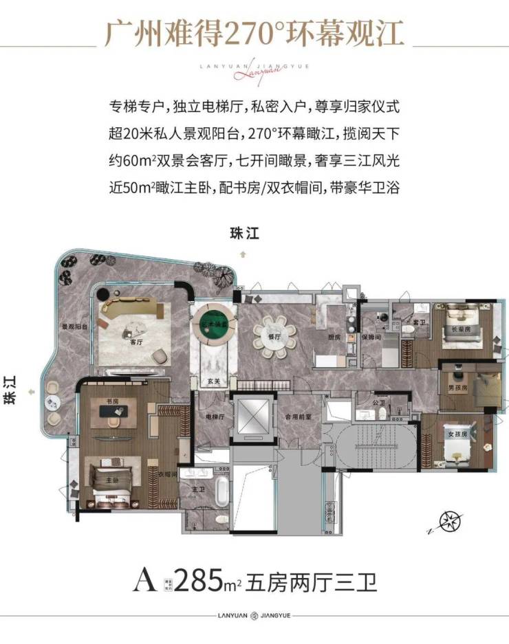 兰园·江悦主要推出极稀缺的豪宅户型,全户型为江景大平层及总统套房设计,单套面积在270㎡以上,充分满足顶层客户对奢阔空间的需求。户型设计强调私密性与舒适性,一梯一户布局,确保每户拥有独立电梯入户体验。