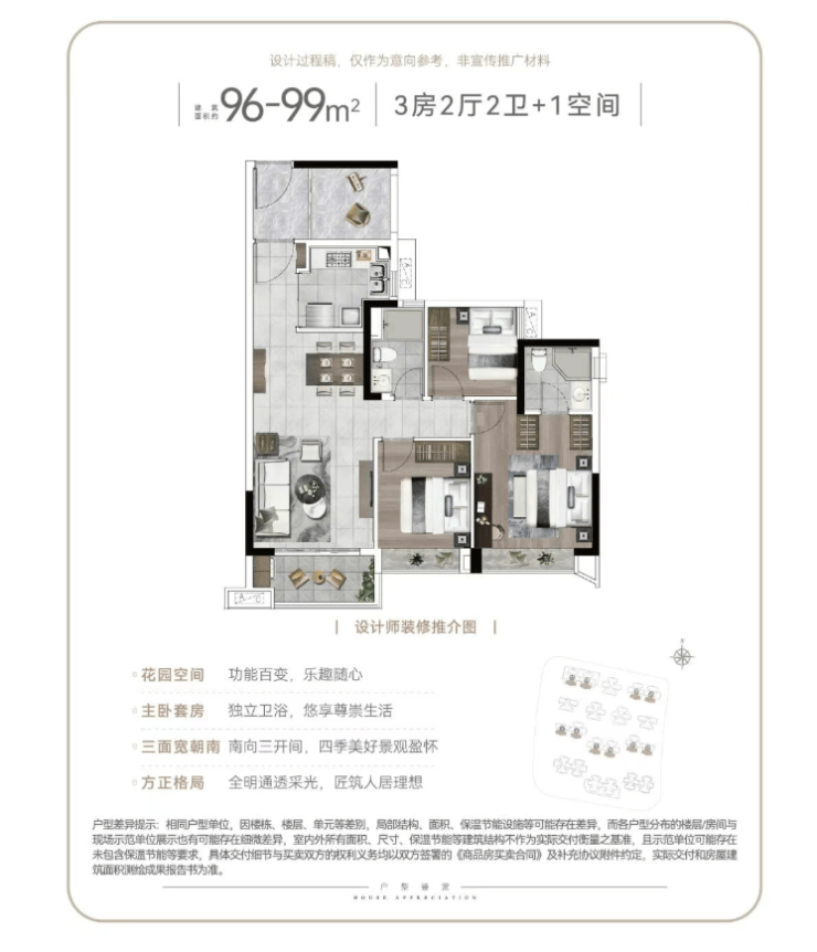 项目主推96-143㎡三至五房,得房率高达92%(竞品普遍≤78%),空间利用率远超市场平均水平: