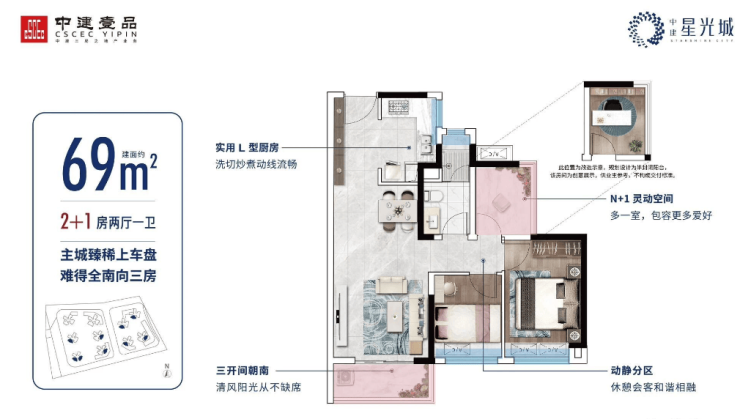 建面约69㎡ 南向三房:稀有纯南向设计,三开间朝南,阳台开间达3.2米,实用率高达94%。