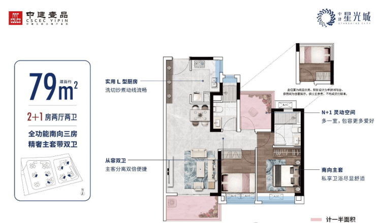 建面约79㎡ 主套双卫3房:地铁口低总价,住带主套的双卫3房,东南向瞰园林,通风采光俱佳。
