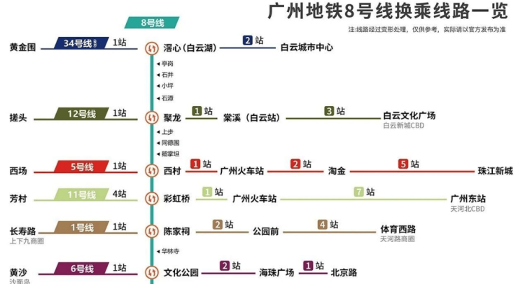 多条线路交汇:目前8号线设有八个换乘站,乘客可轻松换乘至多条地铁线路,包括但不限于1号线、2号线、3号线及广佛线,极大地方便了市民的出行需求。