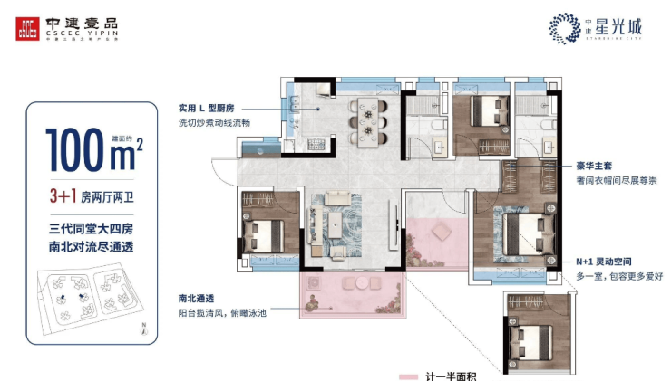 建面约100㎡ 大4房:四开间朝南,南向大阳台瞰景,三代同堂大四房,功能空间应有尽有。