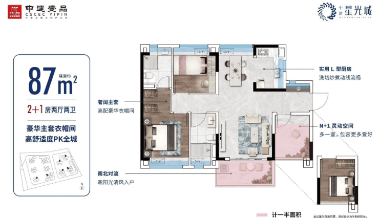 建面约87㎡ 南北通透主套大3房:纯南向通透三房,南北穿堂对流,多功能房设计,餐客厅一体化。