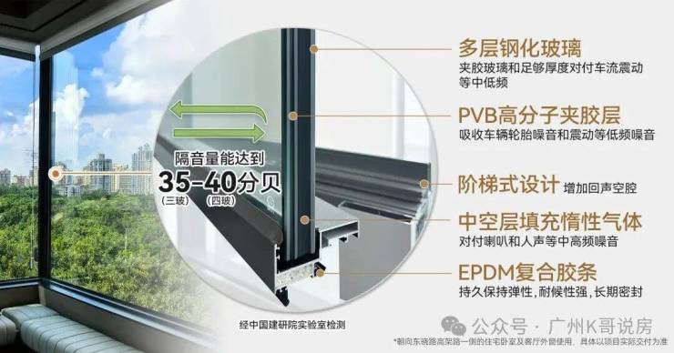 在精装交标方面,项目一脉相承越秀广府系经典的 100 个交标细节,深度贴合广州人的生活习惯与广州的气候特点,打造了极具实用性与人性化的精装交标。在窗户配置上,项目全屋配置了 2-4 层中空玻璃,其中 3-4 层为中空夹胶玻璃,具备极强的隔音、隔热、降噪效果,有效隔绝室外噪音与夏日高温,为业主打造安静、舒适的室内居住环境,同时采用窄框幕墙窗设计,既提升了外立面的高级感,又最大化拓宽了室内的景观视野,让美景尽收眼底。在厨房交标上,项目深度贴合老广煲汤的生活习惯,专门配置了防干烧煲汤专用炉灶,操作台面专门优化了高度与硬度,更适合老广斩料的使用习惯,同时配置了可容纳 20 副碗具的大容量洗碗机,完美适配广州家庭的用餐习惯,细节之处尽显人性化。在收纳系统上,项目全屋定制了大容量收纳柜,收纳板材专门选用了防霉防潮的专用板材,完美适配广州潮湿的回南天气候,有效防止柜体返潮起霉,提升了收纳系统的使用寿命与实用性。